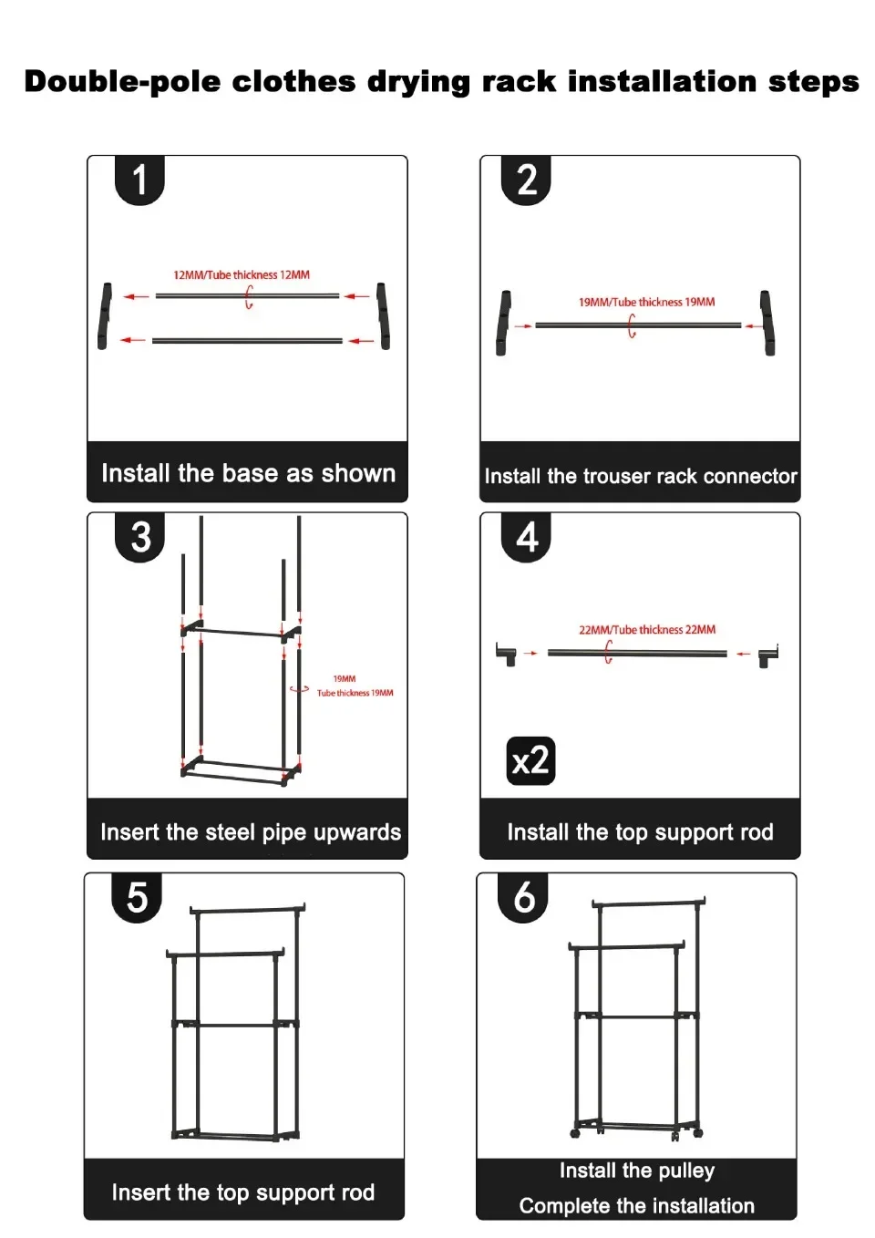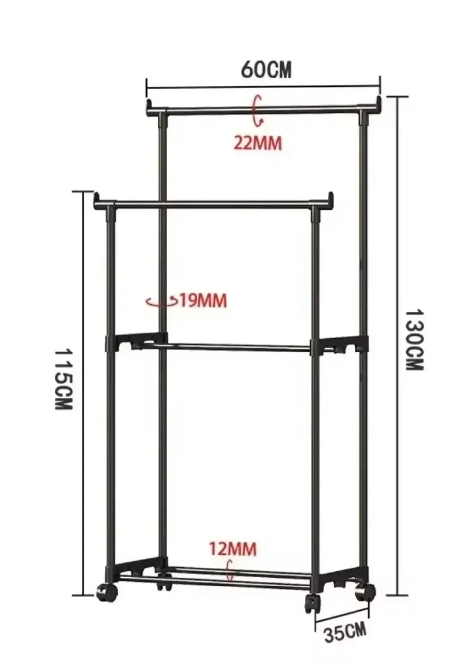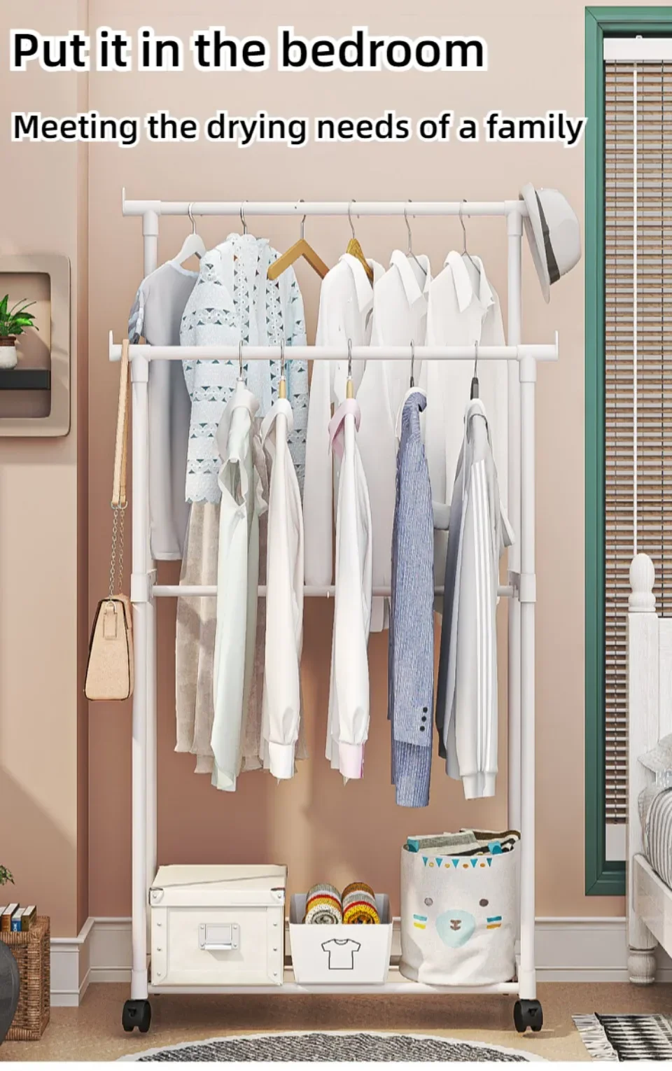Double Rod Coat Rack Floor Standing Clothes Hanger Movable Simple Clothing Shelf Bedroom Storage Rack Assembled Closet Organizer