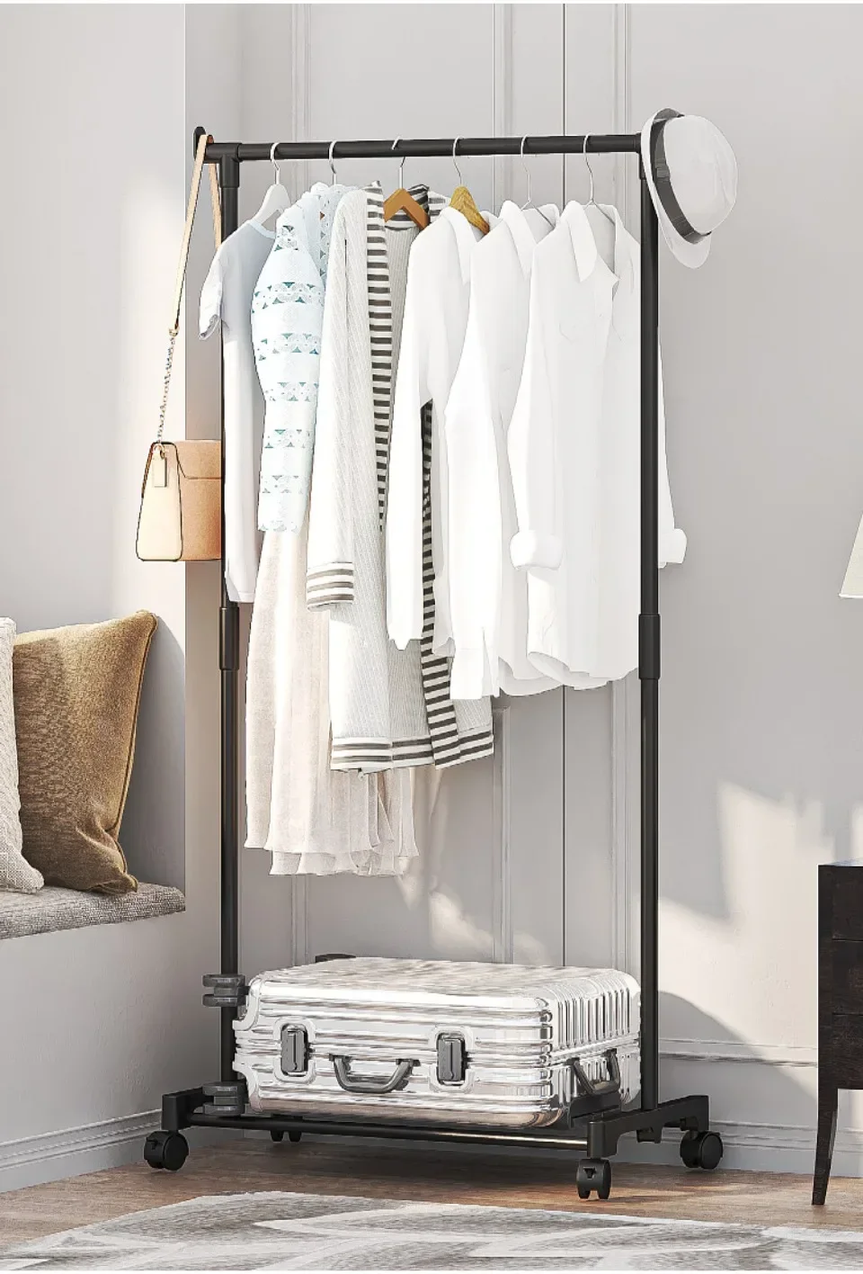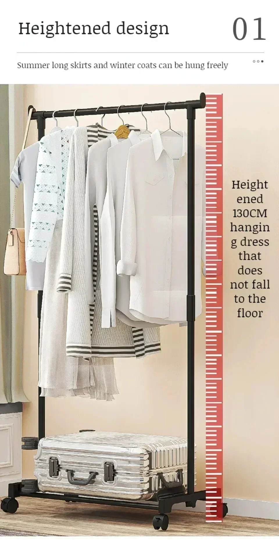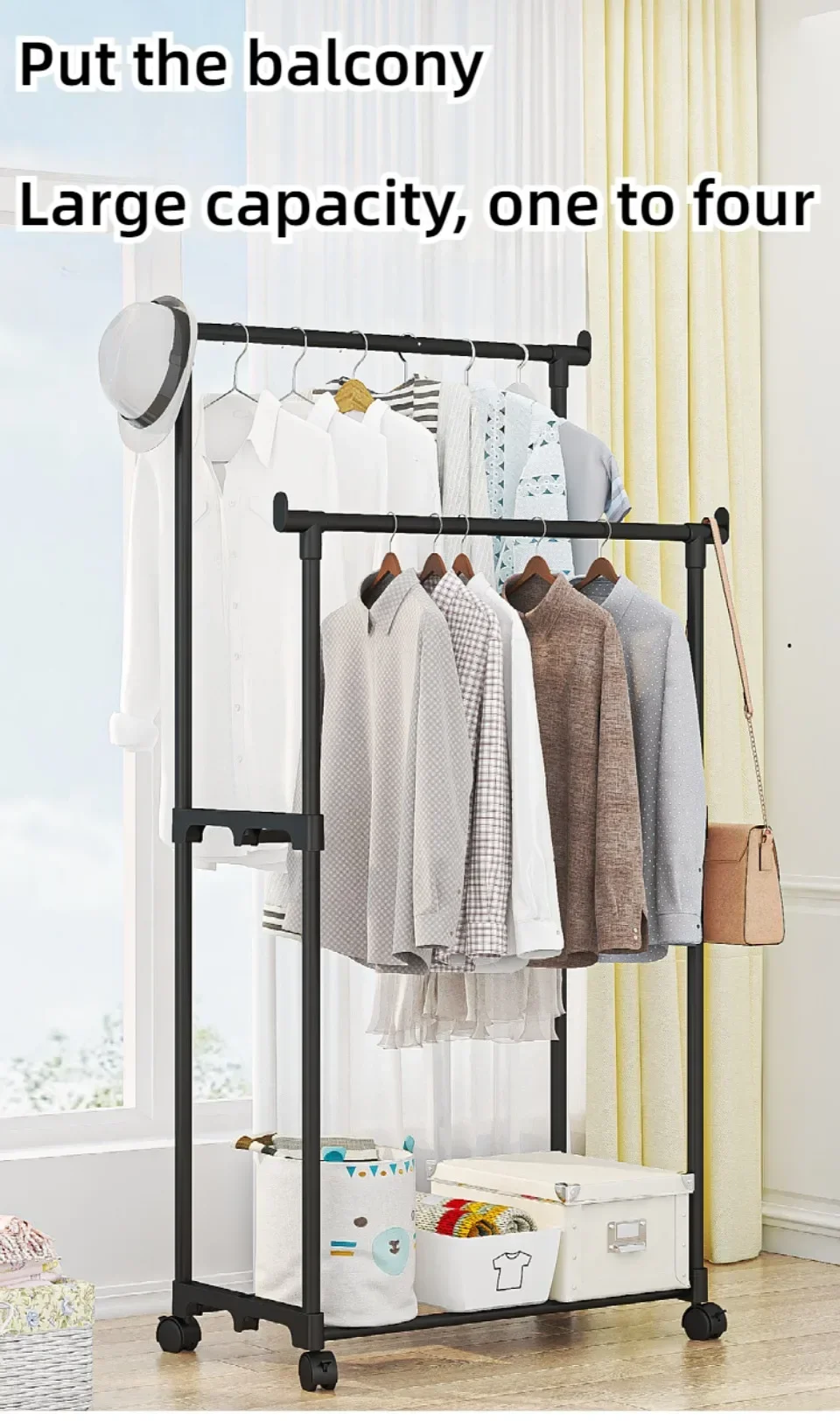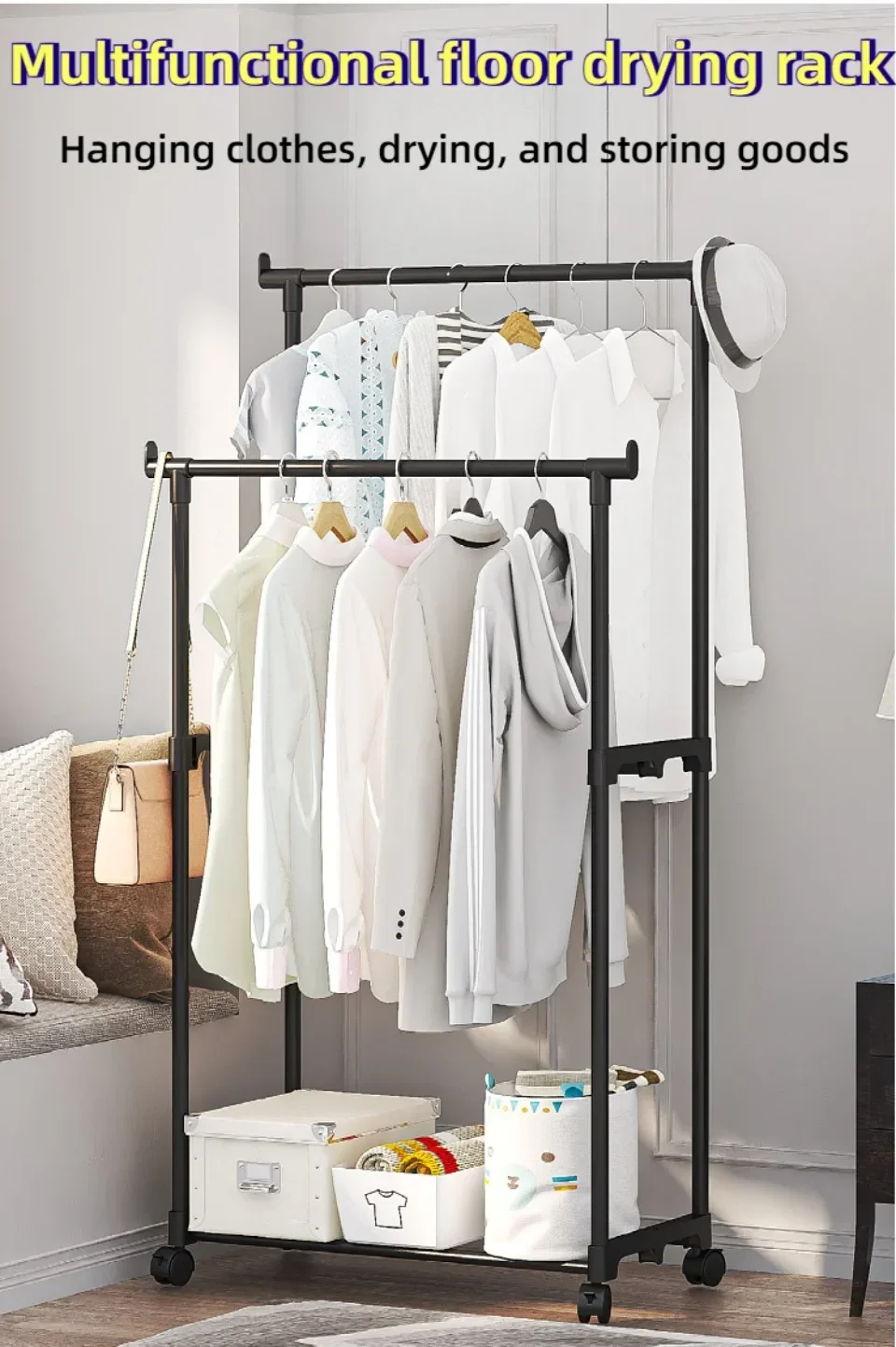 Double Rod Coat Rack Floor Standing Clothes Hanger Portable Simple Movable Clothing Shelf Bedroom Storage Racks Closet Organizer